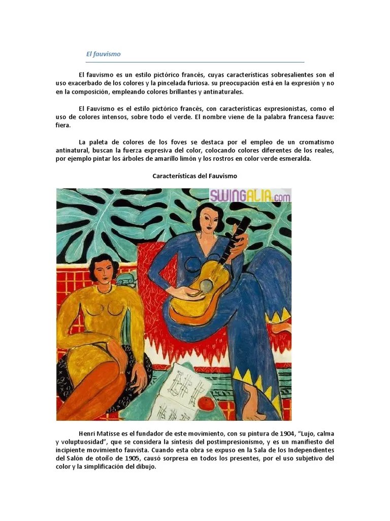 Pintor francés líder del fauvismo.. Pintor francés líder del fauvismo. Durante su trayectoria, supo conjugar en sus obras la influencia de artistas como van gogh o gauguin, con la de las cerámicas persas, el arte africano o las telas moriscas. Retrato de su señora omitiendo toda tradición cromática. 1906 la alegría de vivir es bueno estar vivos. 1908 armonía en rojo una de las obras más conocidas de matisse.