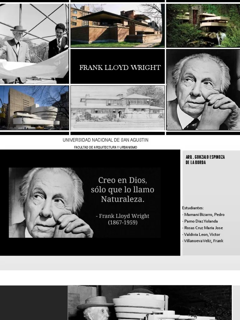 La obra del genial arquitecto norteamericano f... (arquitectura es.) lograr el todo con lo mismo. No militó en el movimiento moderno, pero nos legó un puñado de iconos del siglo xx, como la casa de la cascada (1939) y el museo guggenheim de nueva york (1959). La arquitectura segn frank lloyd wright: Su amplia vida va pareja a su amplia obra, aunque destaca en la creación de viviendas unifamiliares para la burguesía. Es de origen estadounidense y uno de los principales exponentes de la arquitectura modernista. Considerado el «mejor arquitecto estadounidense de todos los tiempos» en una encuesta realizada en 1991 por el instituto americano de arquitectos, frank lloyd wright era un verdadero visionario.. Es de origen estadounidense y uno de los principales exponentes de la arquitectura modernista.